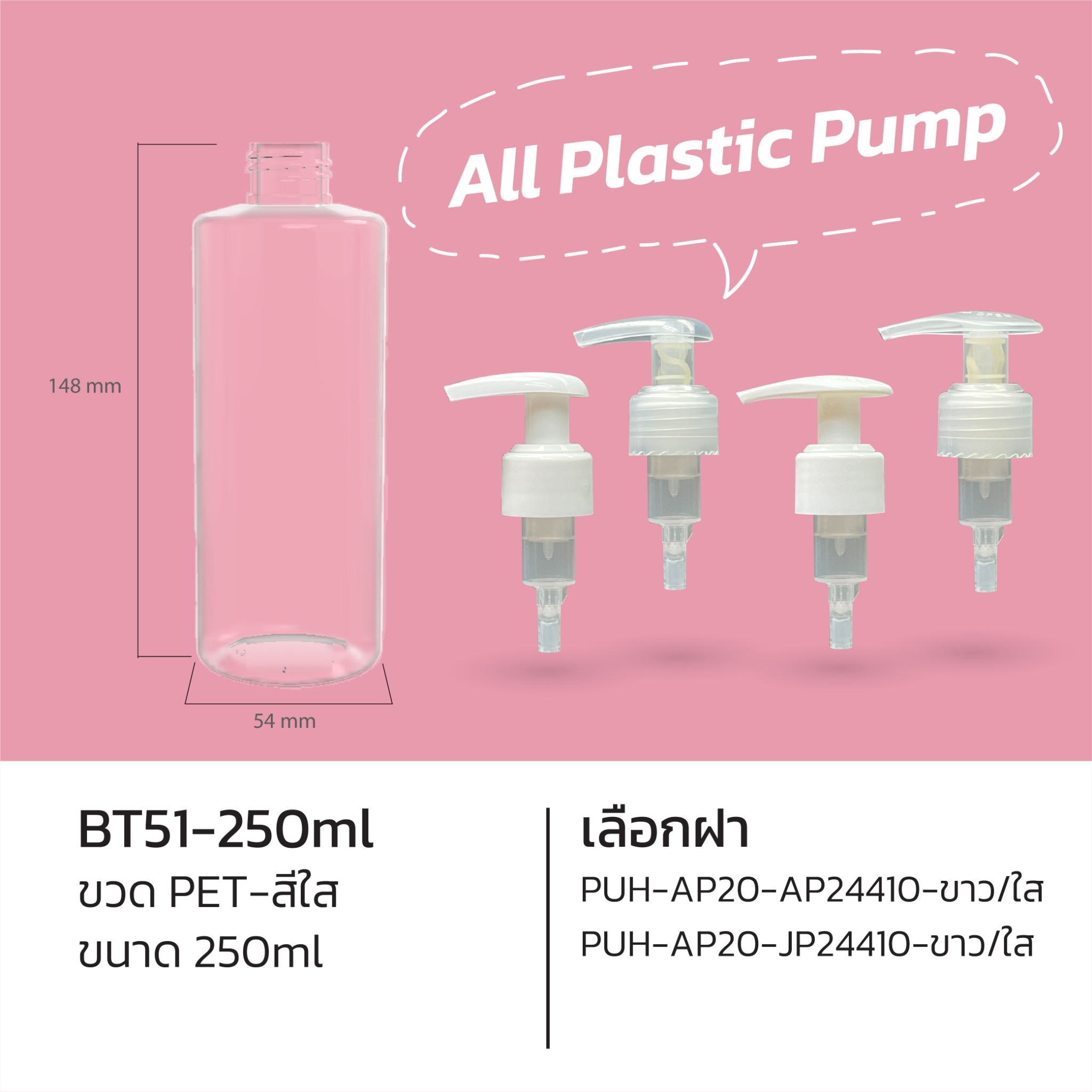 ขวด PET 250 ml. สีใส + ฝาปั๊มขาว/ใส